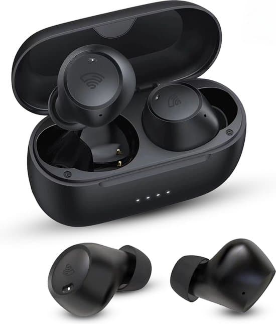 Deze draadloze oordopjes van Soundfront bieden een uitstekende prijs-kwaliteitverhouding. Ze beschikken over actieve ruisonderdrukking tot 26 decibel en worden eenvoudig via bluetooth gekoppeld aan je smartphone of laptop. We vonden het zwarte design stijlvol, genoten van draagcomfort en goede geluidskwaliteit.